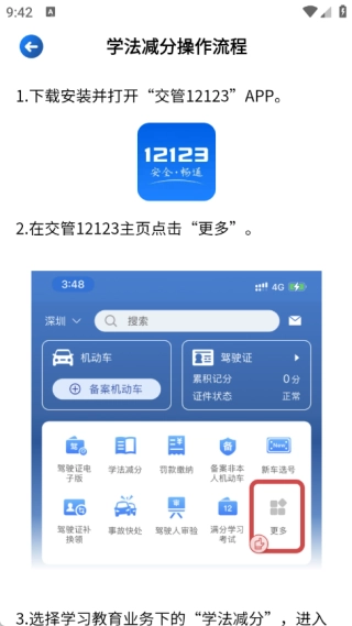 在学法减分页面,用户能够知晓具体的操作流程,按照流程操作就能轻松抵扣已被扣的驾驶分数。