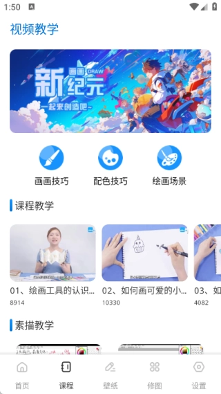 2、课程页面涵盖画画技巧、配色技巧、绘画场景等内容,此外还设有课程教学和素描教学等版块。