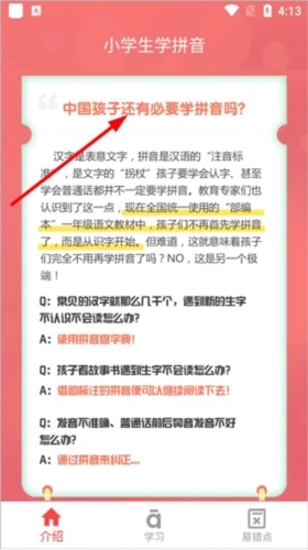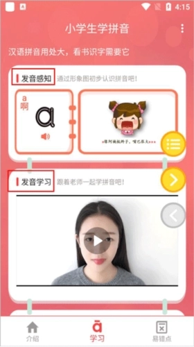 1、打开小学生学拼音,有介绍、学习和易错点版块,介绍主要是关于汉语拼音学习的介绍;