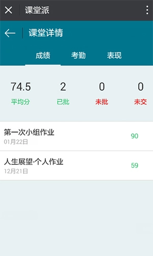2、点击【课堂详情】,进入课程详情页,即可查询作业的批改状态,并统计出平均分,以及已批,未批,未交的次数;