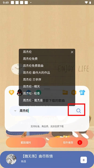 1、安装好软件后打开,在搜索栏输入自己喜欢的歌曲或歌手。例如,周杰伦的歌在其他平台大多需会员才能听,我们在这就可以搜索周杰伦的歌曲查看。