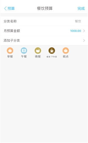 像“餐饮”这类分类,记账选项中的“早餐”“午餐”等都能添加到子分类里,一起纳入餐饮预算。
