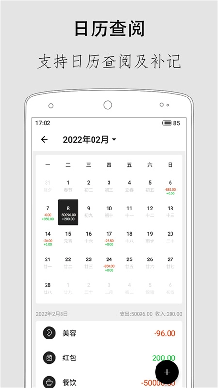 2、日历查询:借助日历可快速查看每月账单,每日的开销明细都能清晰呈现。