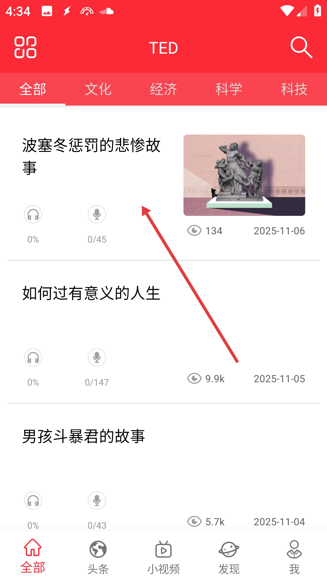1、点击你感兴趣的文章标题,例如《波塞冬惩罚的悲惨故事》,即可进入文章详情页面。
