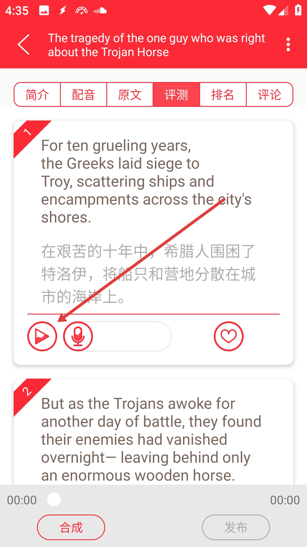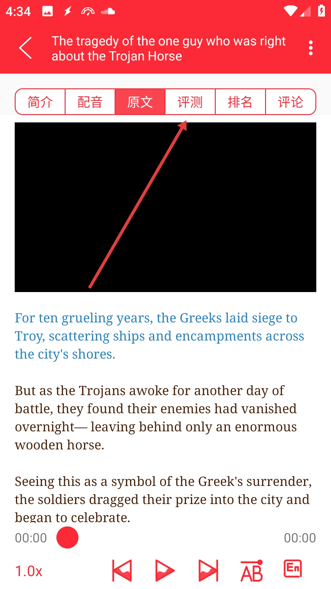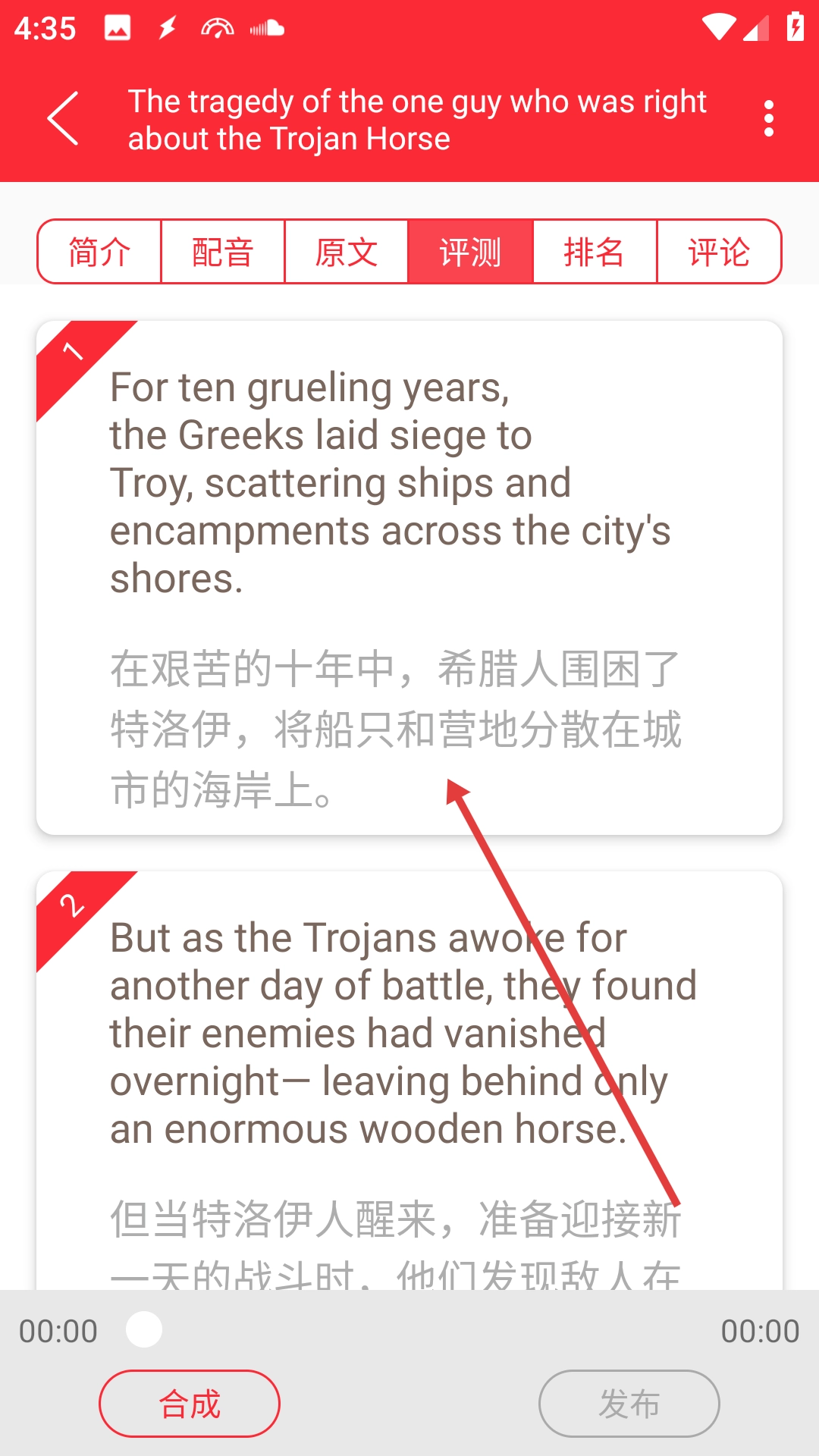 3、点击【评测】标签页,即可查看文章对应的中英文对照评测内容。