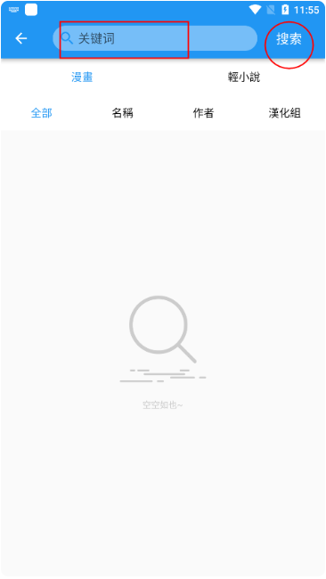 5、在搜索页面输入漫画相关的关键词,就能开始查找了。