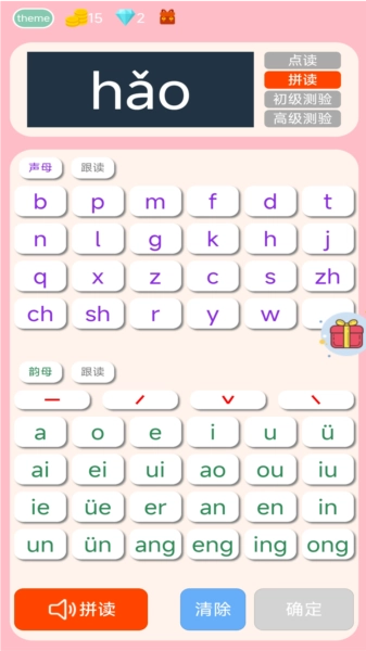 选择“拼音拼读”功能,能够学习各类组合的拼读发音。该功能支持自由拼读,用户可依据自身需求,挑选对应的声母、韵母与声调来进行组合拼读。