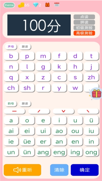 “高级测验”功能主要用于检验拼音拼读的学习成果。系统会给出包含声母、韵母与声调的完整拼音音节,用户需选择对应的正确读音或完成拼写操作。依托海量的题库资源,能够全面考察用户对拼音知识的实际掌握情况。