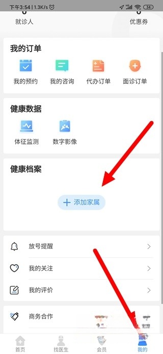 1若要开展实名认证,需进入“我的”页面,寻得“健康档案”选项,并点击“添加家属”。