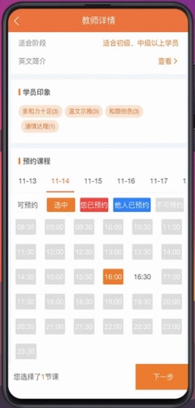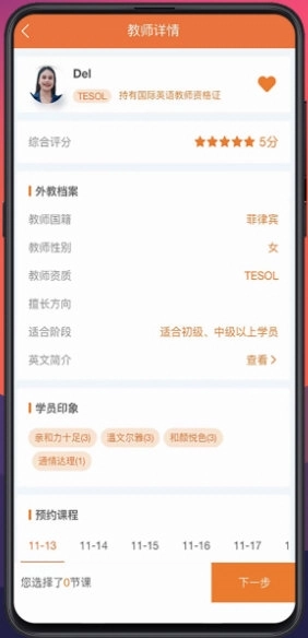 挑选外教:浏览外教的相关资料,了解其教学经历、学员给出的评价以及可预约的时间。