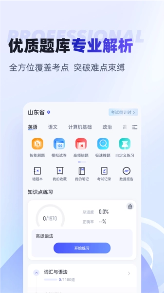 统招专升本聚题库以其全面的资源、智能化的服务以及高度的用户友好性,无论是初学者还是冲刺期的考生,都能在此找到适合自己节奏的学习方案。软件不仅在内容上做到了精益求精,更在用户体验上下足功夫,无论是界面设计还是功能布局,都力求简约而不失专业。统招专升本聚题库正不断向着更高质量、更全面、更人性化的方向迈进,是每一位专升本考生值得信赖的备考伙伴。