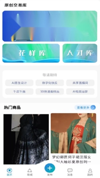 围绕曹县特色产业的实际发展状况,规划设置了AI原型设计、共享直播间、线上选品中心、版型库、花型库、人才库、汉服网商学院、元宇宙体验馆以及跨境电商等多个功能模块,可提供线上展示交易、信息发布、技术支持、版权交易、人才对接、品牌推广与跨境营销等丰富多元的服务内容。