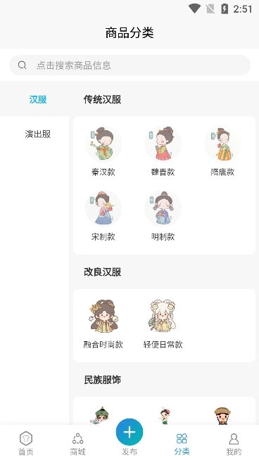 平台上的汉服品类丰富多样,覆盖了从婴幼儿到成人的全年龄段,并且按照“晋制”“唐制”“宋制”“明制”等不同形制进行了细致划分,便于用户精准检索心仪的款式。