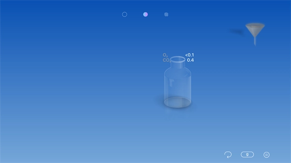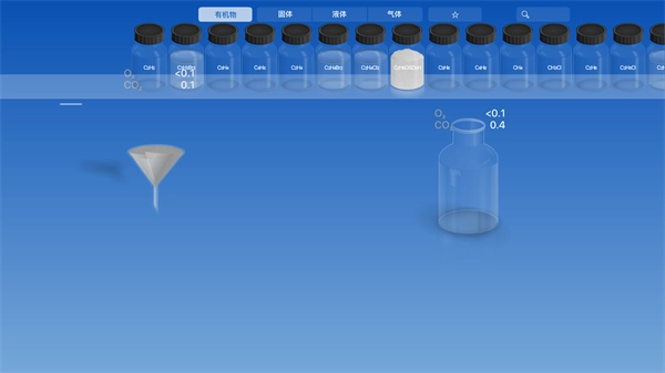 2、把器皿摆放妥当后,接下来就可以点击“水滴”图标来挑选各式各样的化学原料了。这款软件提供了化合物、固体颗粒、液体以及气体这四大类原料,当选择对应的化学原料时,系统会显示出该原料所含的相关化学元素。
