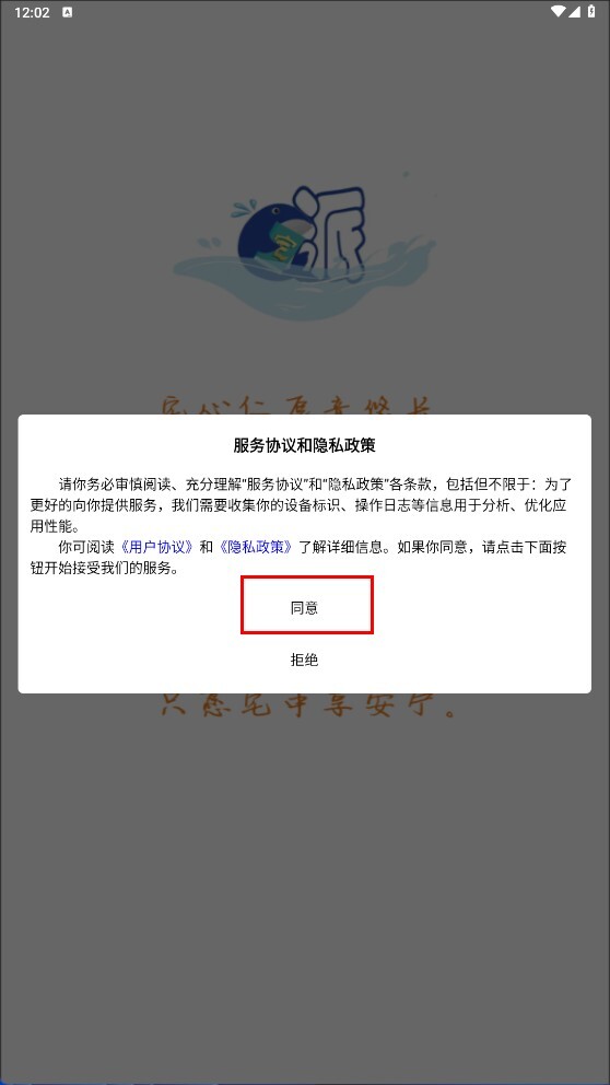 当出现服务协议和隐私政策的弹窗时,点击【同意】按钮,完成协议确认操作,即可继续使用该应用。