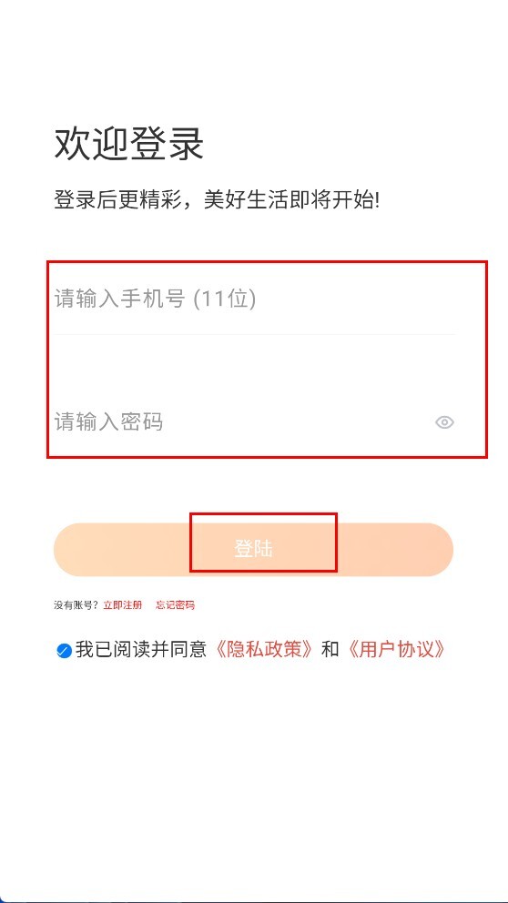3、进入登录页面后,先输入11位手机号码,接着输入该手机号对应的密码,勾选相关协议条款,最后点击【登录】按钮,即可完成账号的登录流程。
