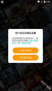 1、安装好趣点云游戏应用,启动该软件后,同意相关的用户协议与隐私设置;