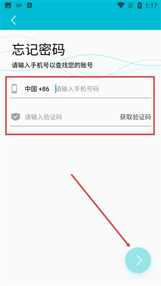 2、进入“忘记密码”页面后,输入已绑定的手机号码,点击【获取验证码】并填写收到的验证码,就能进入重置密码的环节。