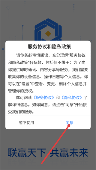 1、在【服务协议和隐私政策】弹窗里,点击【同意】按钮,即可进入登录页面。