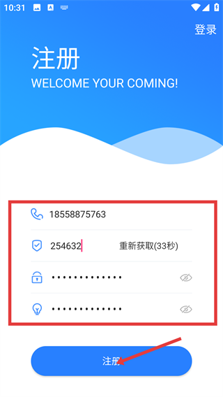 3、进入注册页面后,依次填写手机号、验证码、密码等相关信息,随后点击【注册】按钮,即可完成账号的注册流程。