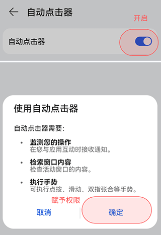 3、进入该界面后,点击开启自动连点神器功能,随后确认我们所做的选择;