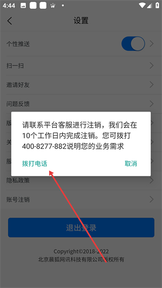4、在提示框内找到【拨打电话】按钮并点击,通过该方式联系平台客服,向客服说明具体的业务需求,进而完成账号注销的相关操作。