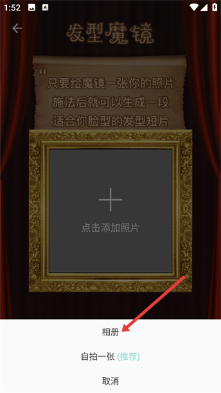 2、进入“发型魔镜”界面后,点击“点击添加照片”的区域,即可弹出照片来源选择的选项窗口。