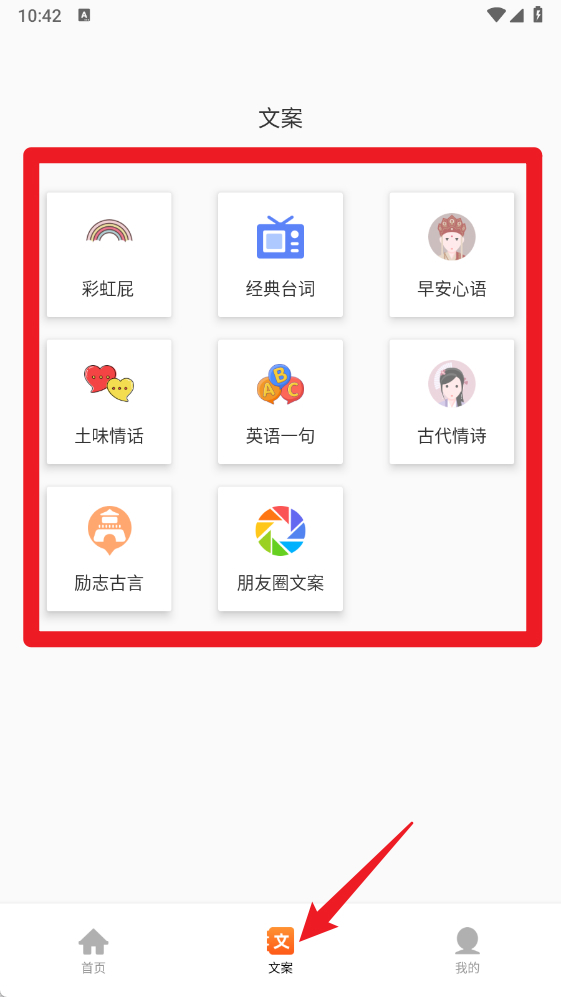 2、点击“文案”板块,能够查看彩虹屁、经典台词、早安心语、古代情诗等各类文案,可满足不同场景下的使用需求。