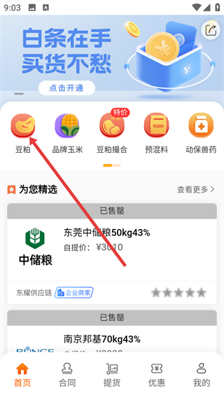 1、打开软件首页,点击【豆粕】图标,就能进入豆粕产品列表页面,进而浏览相关产品。
