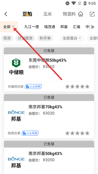 在豆粕页面,点击【全部】下拉选项,会展开区域筛选菜单,从而能进一步筛选产品。
