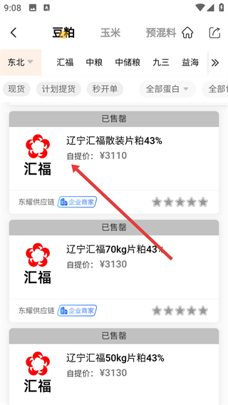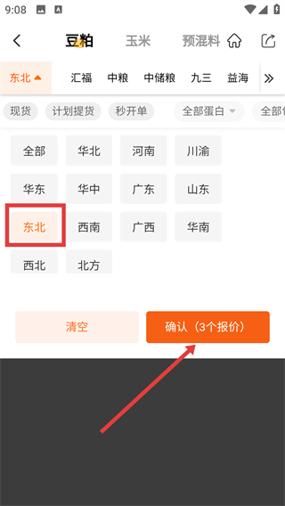 3、在区域筛选菜单里选定【东北】区域,接着点击【确认(3个报价)】按钮,就能筛选出东北区域的豆粕产品了。