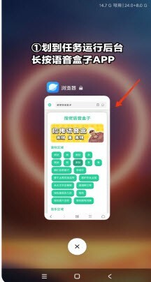 2、然后划到任务运行后台,长按贝利亚语音盒子;