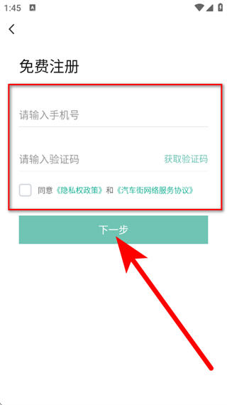 4、进入免费注册页面后,依次完成手机号输入、验证码填写和协议勾选的操作,随后点击下一步按钮。