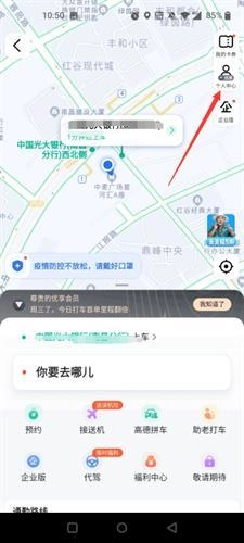 1、打开软件后,进入打车界面,这里包含了预约用车、即时打车、接送机、拼车、助老打车等多种服务选项,接着我们需要设置好出发地点和目的地。