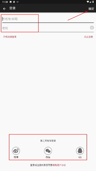 3、登录界面支持两种登录方式,一是使用账号密码进行登录,二是借助微信、微博、QQ等第三方平台账号实现快捷登录。