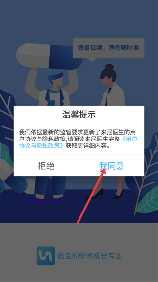 1、当出现【来尼医生-】的【用户协议与隐私政策】更新提示时,请先仔细阅读依据最新监管要求调整的相关内容,再选择对应的选项。