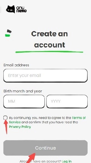 1.首先打开应用程序或访问相关网站,找到并点击Sign up按钮,接着填写电子邮箱与出生日期,勾选同意相关条款后,点击页面底部的Continue按钮。