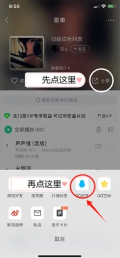 1. 先打开QQ音乐,进入歌单页面后点击“分享”按钮,接着把歌单链接发送给自己(或者任意联系人,这样就能获取到歌单链接了)。