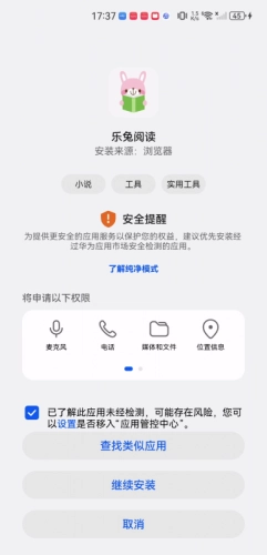 3、点击勾选“已了解此应用未经检测……”,然后点击“继续”按钮。