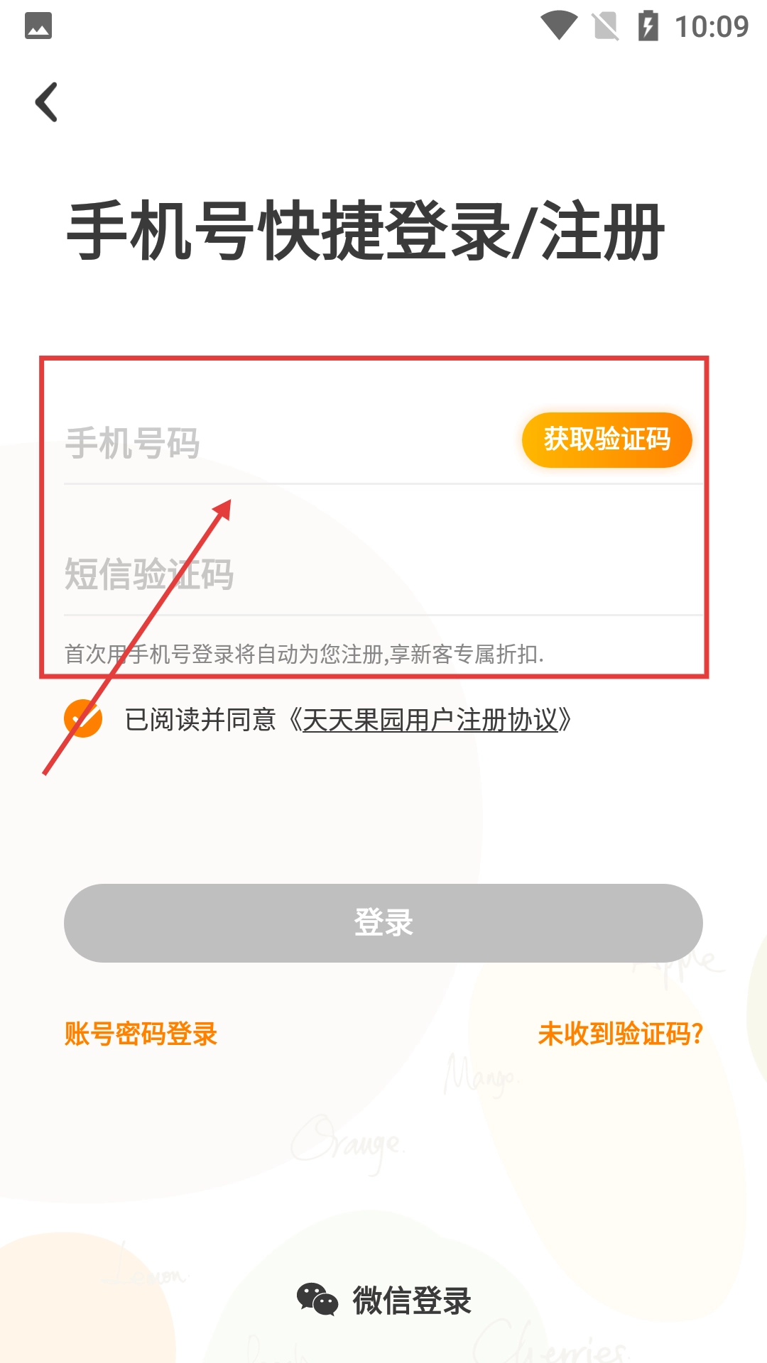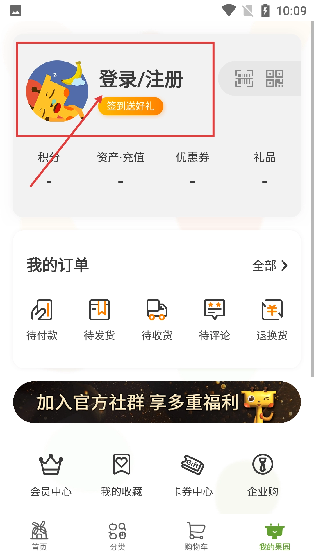 2、进入【我的果园】界面后,点击【登录/注册】区域,既能进入登录流程,也可参与签到送好礼活动。