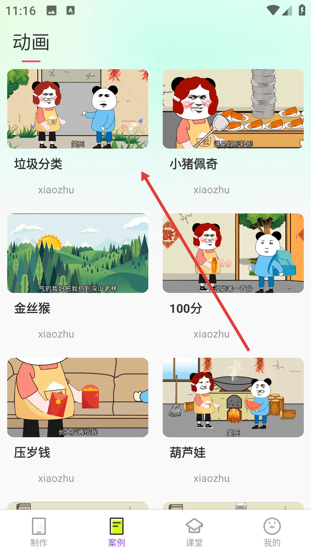 2、在案例页面找到“垃圾分类”动画案例并点击,进入该案例的详情页面。