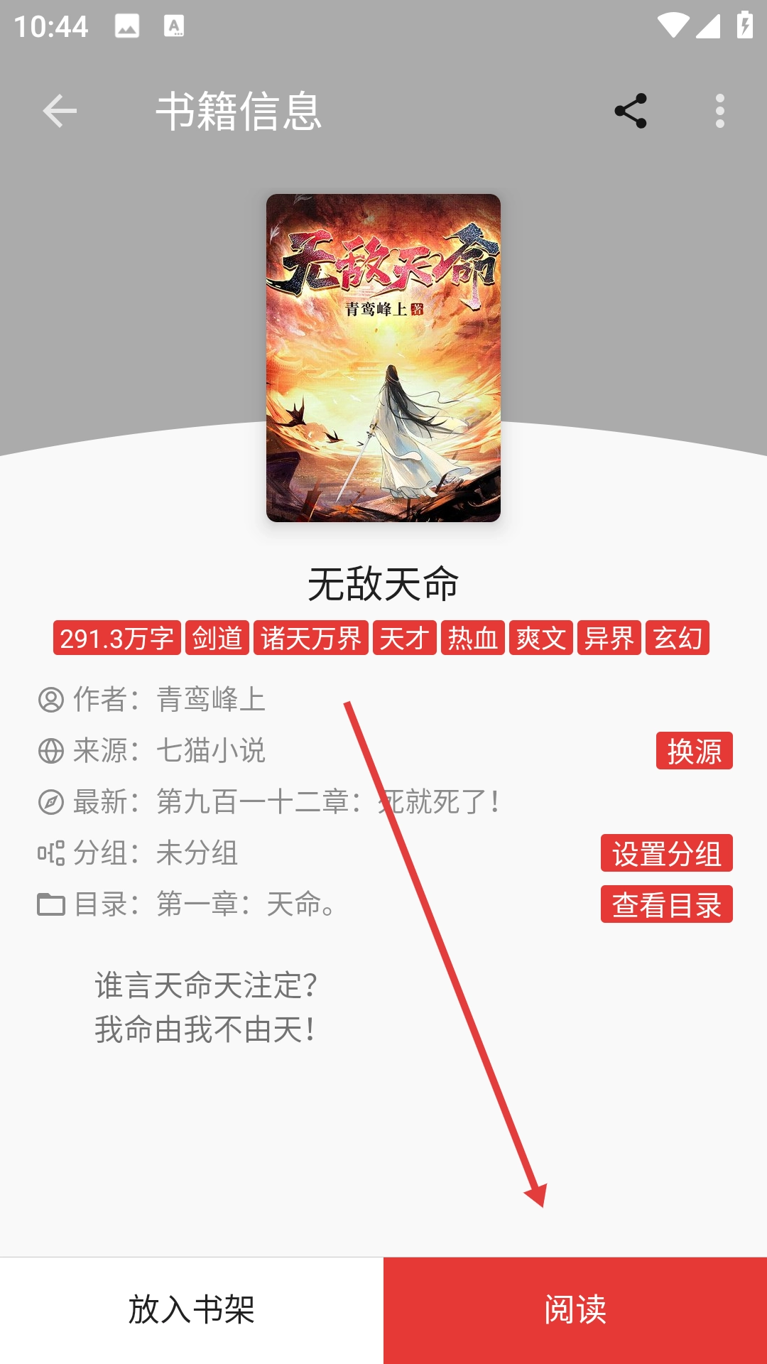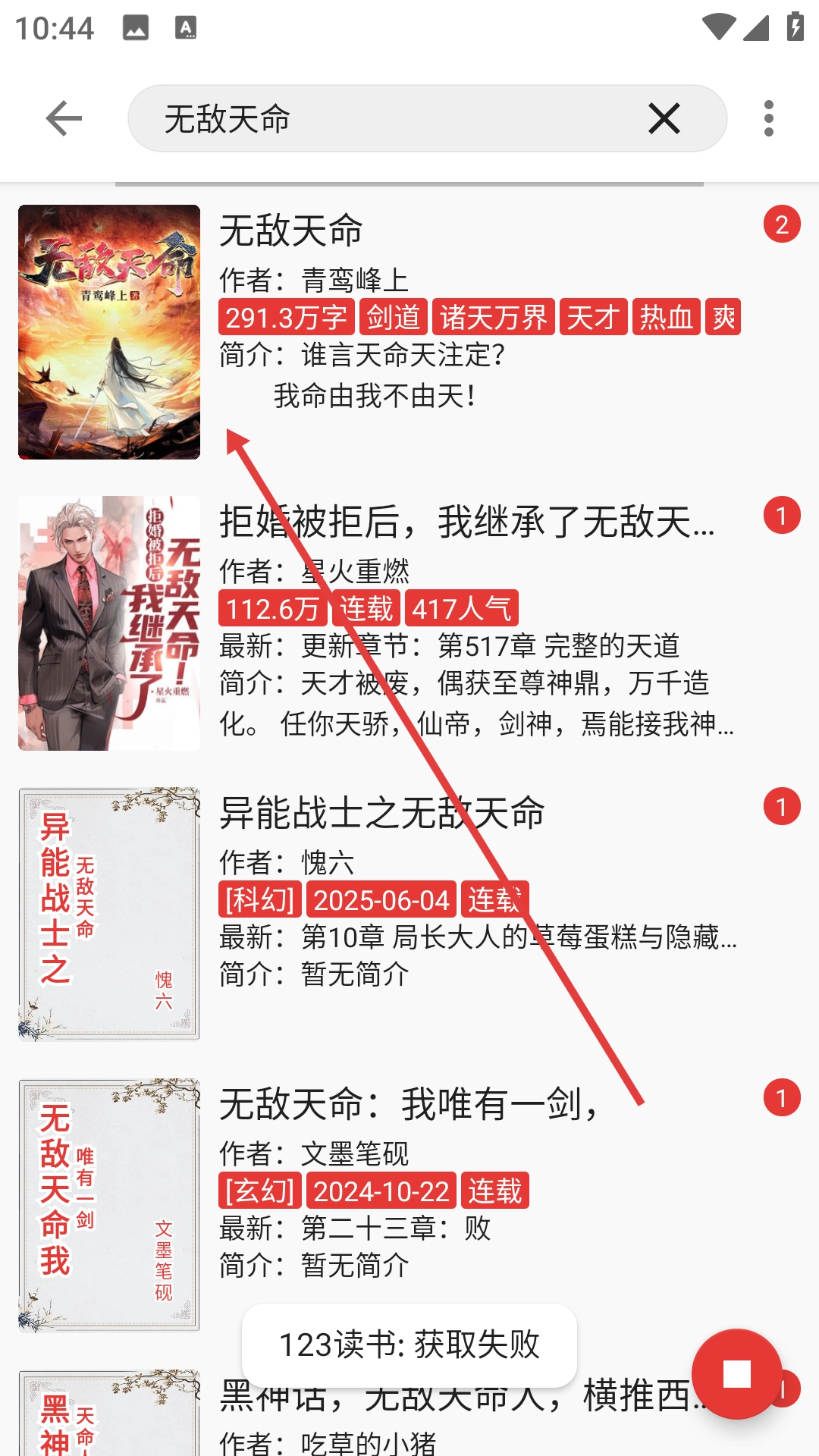 3、在搜索结果里找到《无敌天命》并点击,就能进入该书的信息页面。