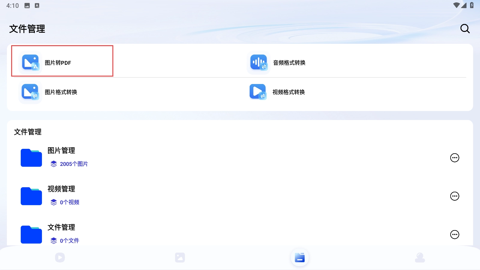 2、在文件管理页面,点击【图片转PDF-功能选项】,进入图片选择页面。