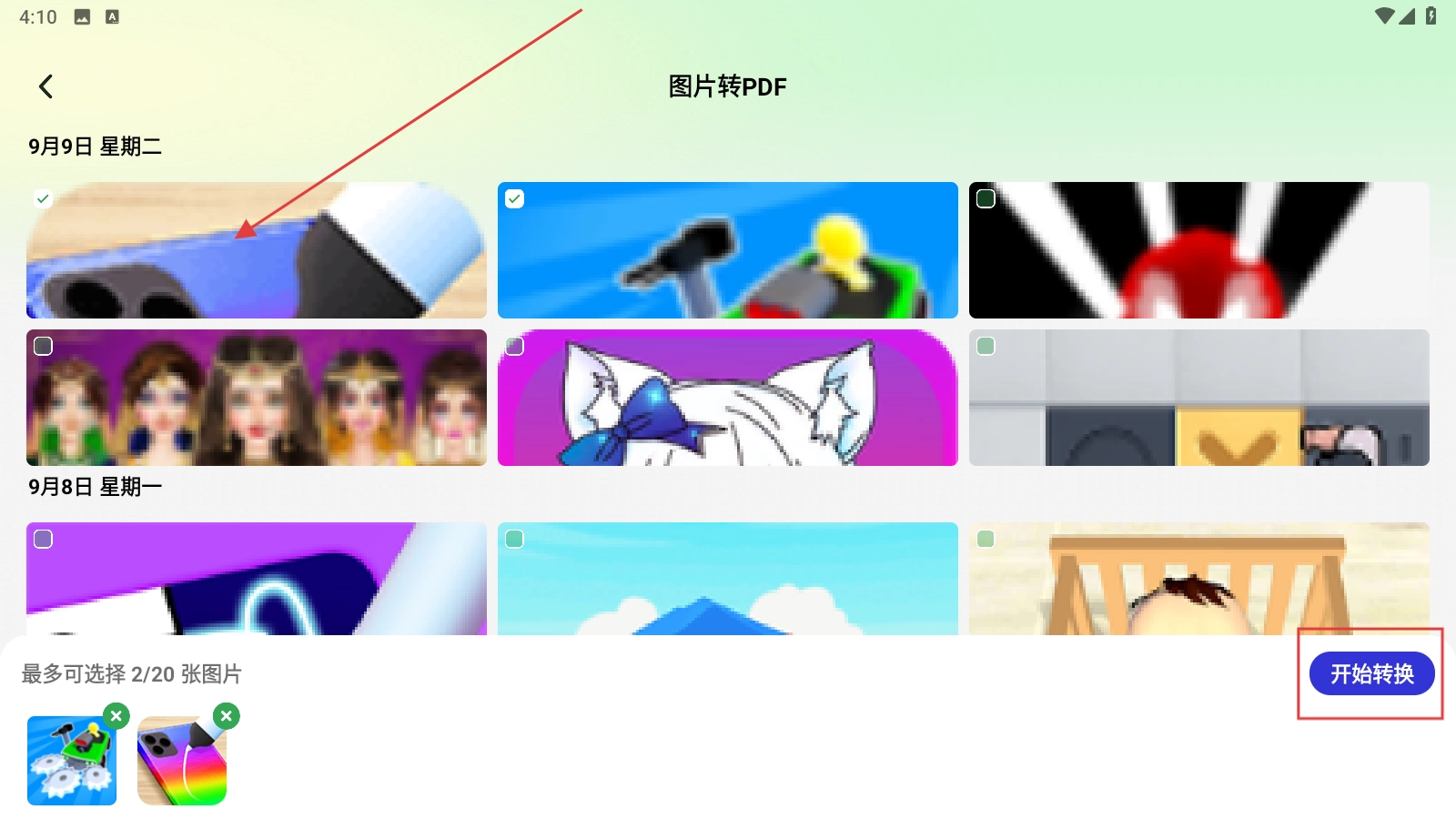 3、进入图片选择页面后,选定要转换的图片,接着点击【开始转换】按钮。