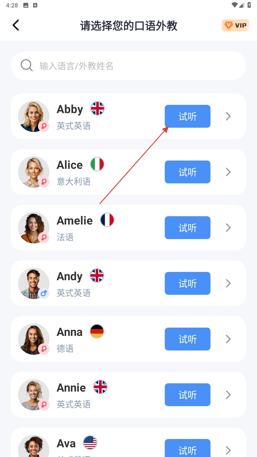 4、进入口语外教选择页面后,点击外教旁边的【试听】功能按钮,即可开启口语试听。