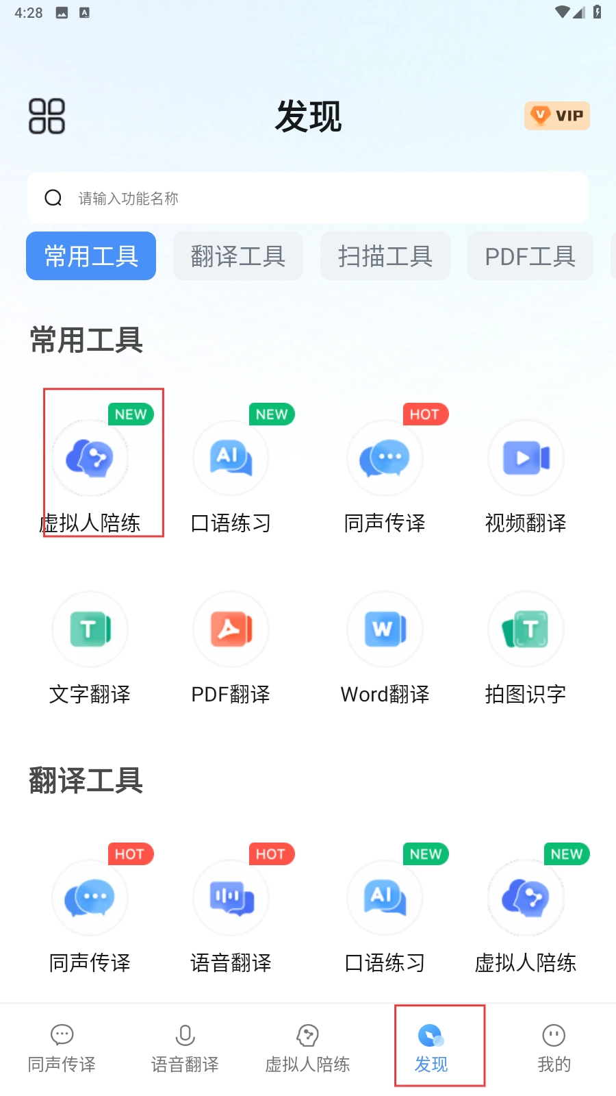 2、点击底部的【发现】功能按钮,进入发现页面后,找到并点击【虚拟人陪练】的功能图标。