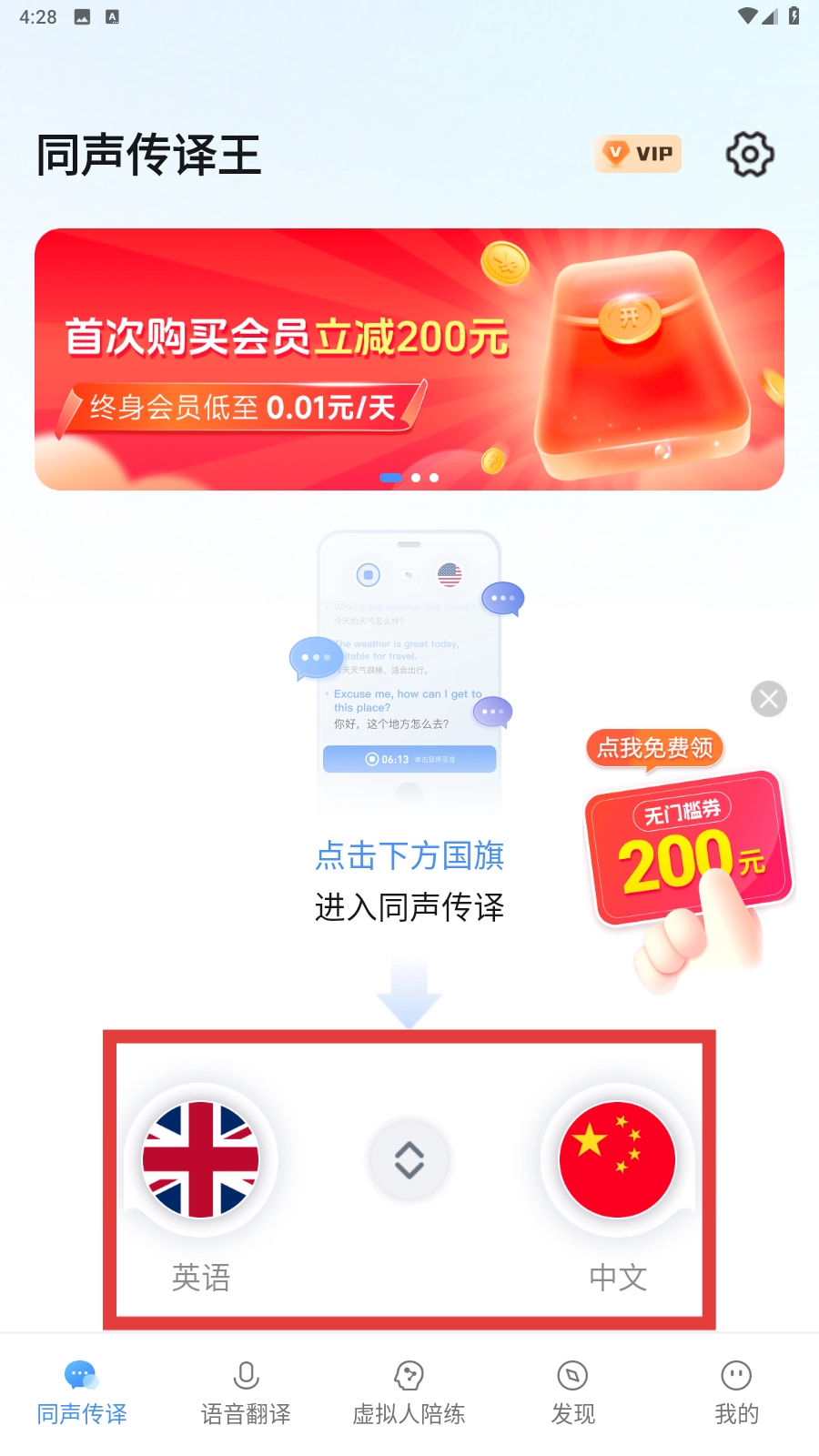 1、点击页面下方的【英语-国旗图标】与【中文-国旗图标】,即可进入同声传译界面。