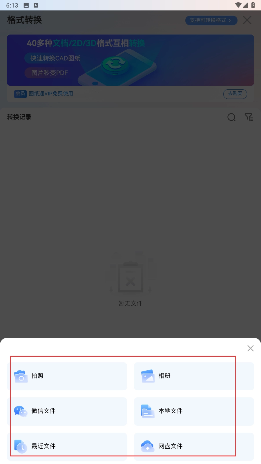 4、在文件来源选择框里,可选择相册、微信文件、本地文件等不同来源,从中挑选需要转换的文件来完成格式转换操作。