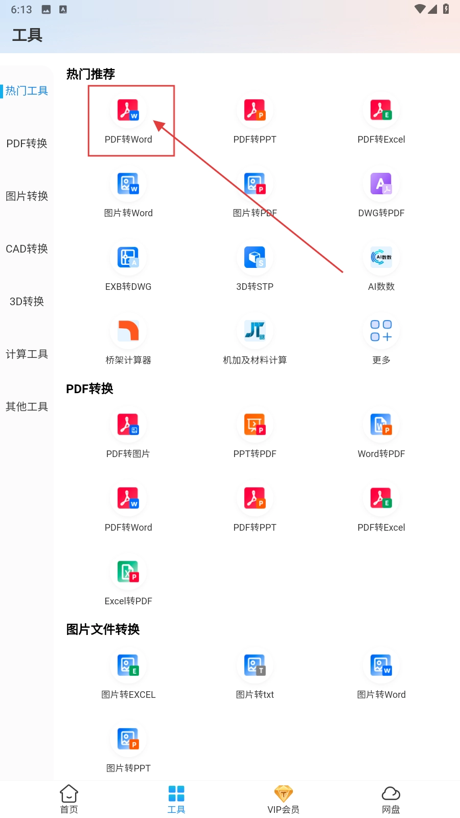 2、在工具页面中,选择类似【PDF转Word-功能选项】这样的选项,即可进入格式转换页面。
