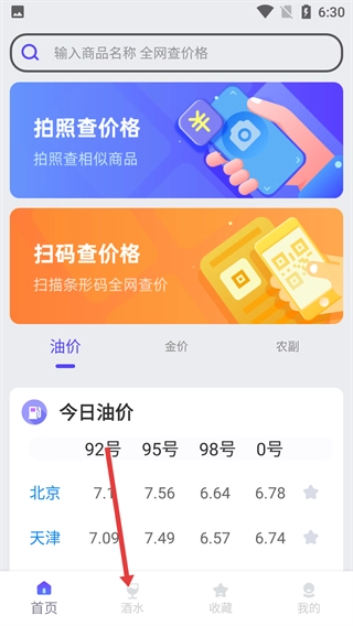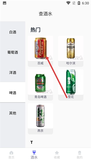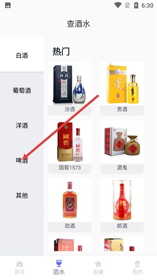 1、在软件首页,点击底部的【酒水】选项,进入酒水查询板块,就能查看各类酒水的分类。